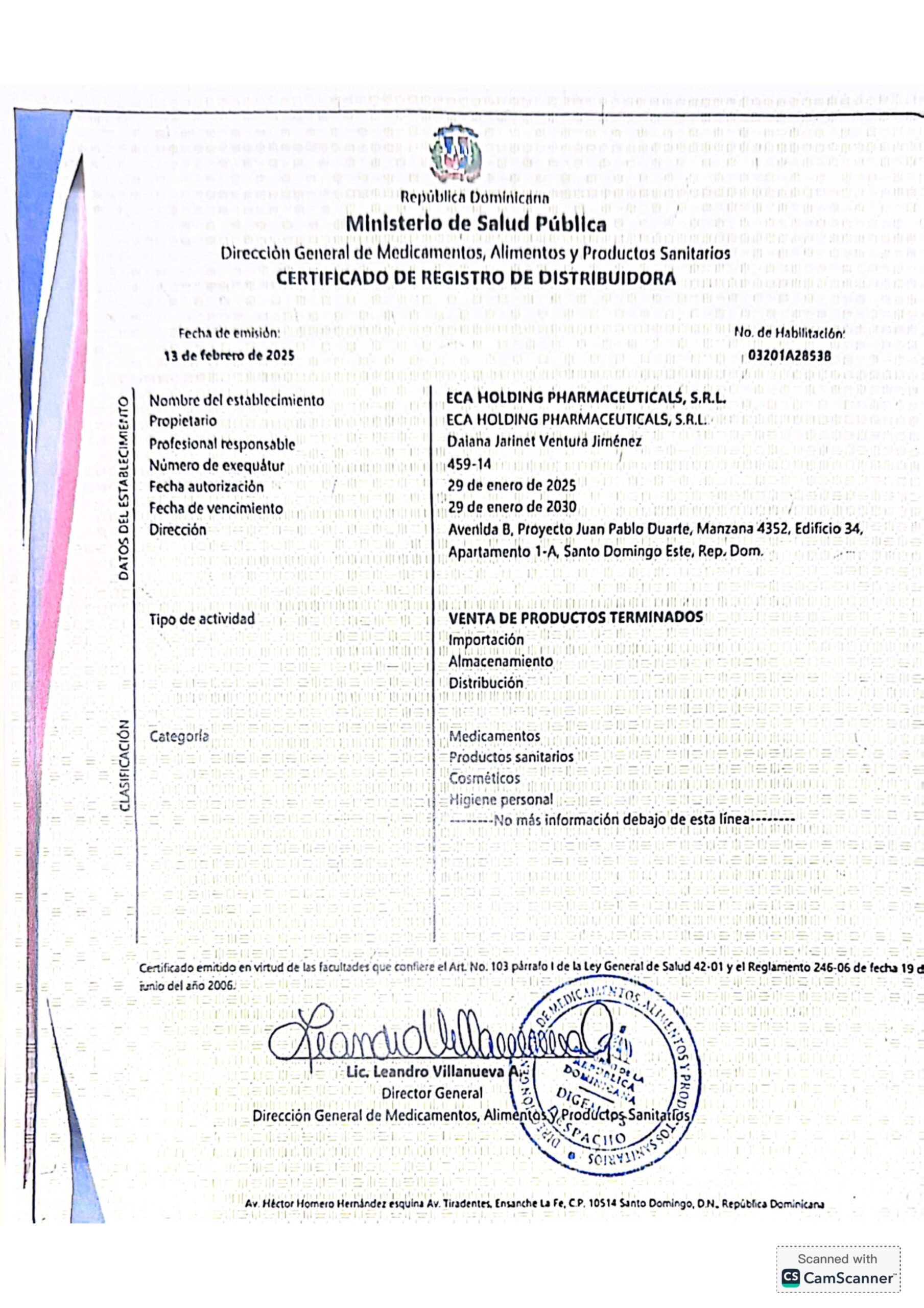 Contamos con la certificación oficial emitida por el Ministerio de Salud Pública de la República Dominicana, que nos acredita como empresa autorizada para la importación, almacenamiento y distribución de productos farmacéuticos, sanitarios, cosméticos y de higiene personal.